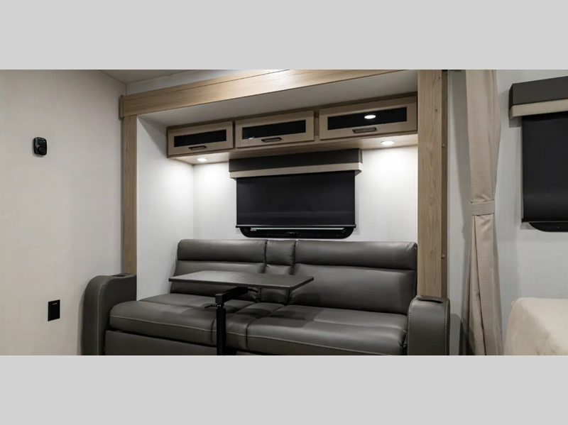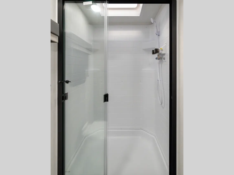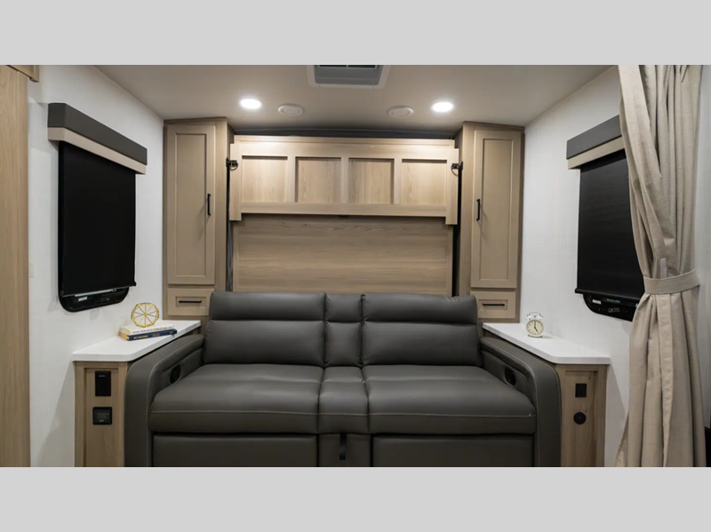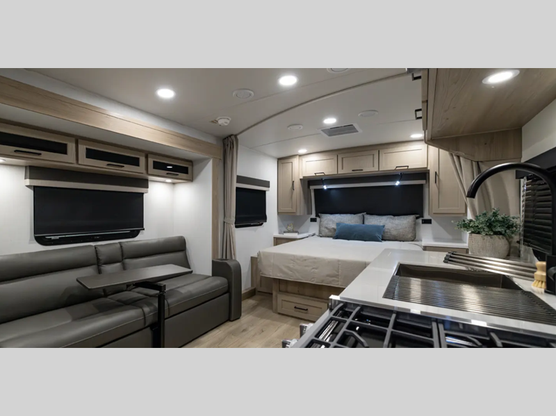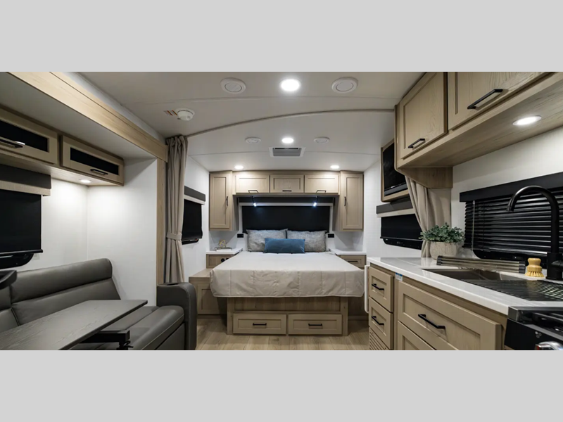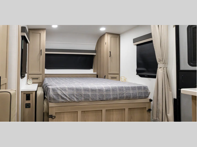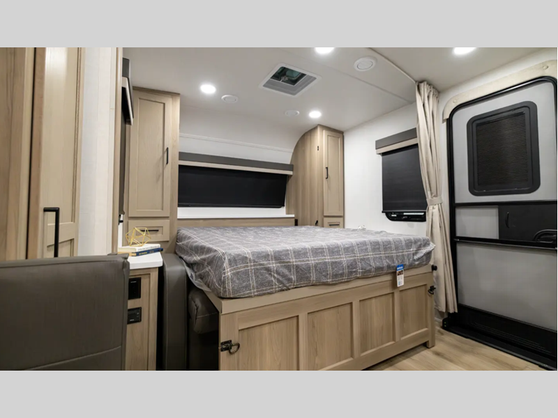 Each model is constructed with a fully laminated walkable roof, 6-sided full-aluminum frame, and a fiberglass front cap with Clear Coat for added protection. You will appreciate the slam baggage doors and 200W solar panel outside, plus there is a Climate Protection Package for better insulation. Inside, you'll love the solid surface countertops, roller shades, and soft close roller bearing drawers.