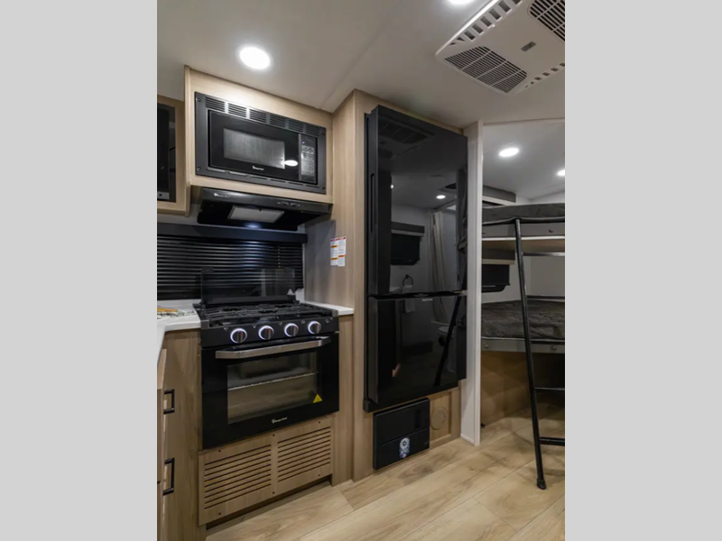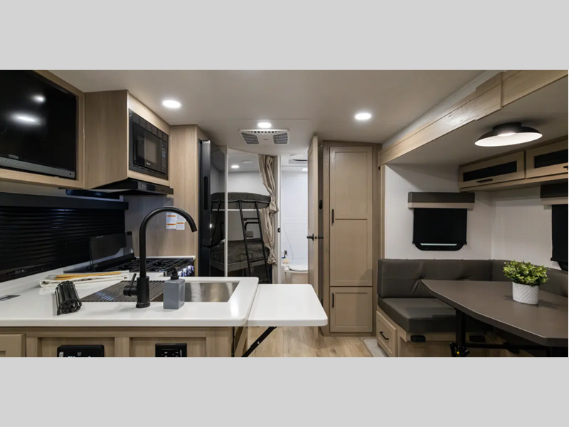 Sleeps 6 Slides 1 Length 25 ft 10 in Ext Width 8 ft Ext Height 10 ft 11 in Hitch Weight 580 lbs Dry Weight 5594 lbs Cargo Capacity 1986 lbs Fresh Water Capacity 54 gals Grey Water Capacity 29 gals Black Water Capacity 29 gals Furnace BTU 35000 btu Number Of Bunks 2 Available Beds RV Queen Refrigerator Type 12V Cooktop Burners 3 Number of Awnings 1 LP Tank Capacity 30 lbs Water Heater Capacity 6 gal Water Heater Type Gas/Electric with Quick Recovery AC BTU 15000 btu TV Info LR 12V Smart Entertainment TV Awning Info 18' Power with Adjustable Rain Dump and LED Lights Axle Count 2 Number of LP Tanks 2 Shower Type Radius Similar Floorplans